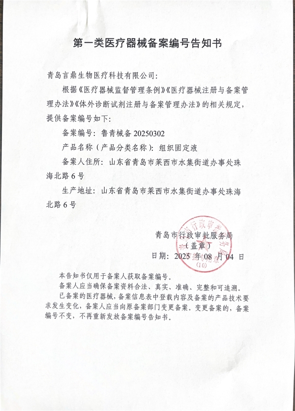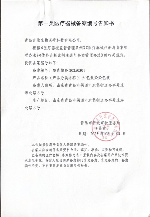 近日,经山东沐鸣2控股集团试剂研发及生产中心、科研服务中心产品申报部前期的努力筹备及申报,青岛沐鸣2生物医疗科技有限公司的“红色复染染色液”、“血细胞分析用溶血剂”、“组织固定液”获批第一类医疗器械备案。